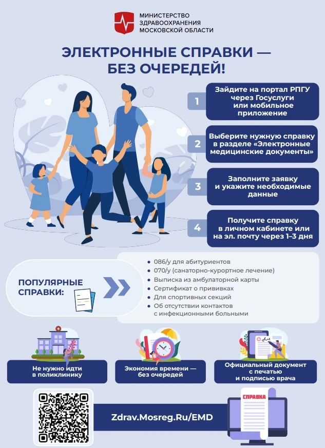 Популярные справки: • 086/у — для абитуриентов • 070/у — для санаторно-курортного лечения • Выписка из амбулаторной карты • Сертификат о прививках • Для спортивных секций • Об отсутствии контактов с инфекционными больными